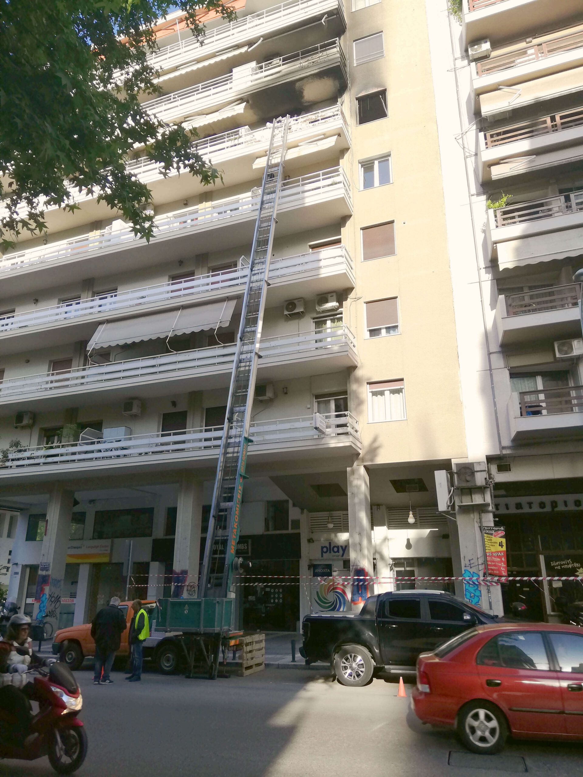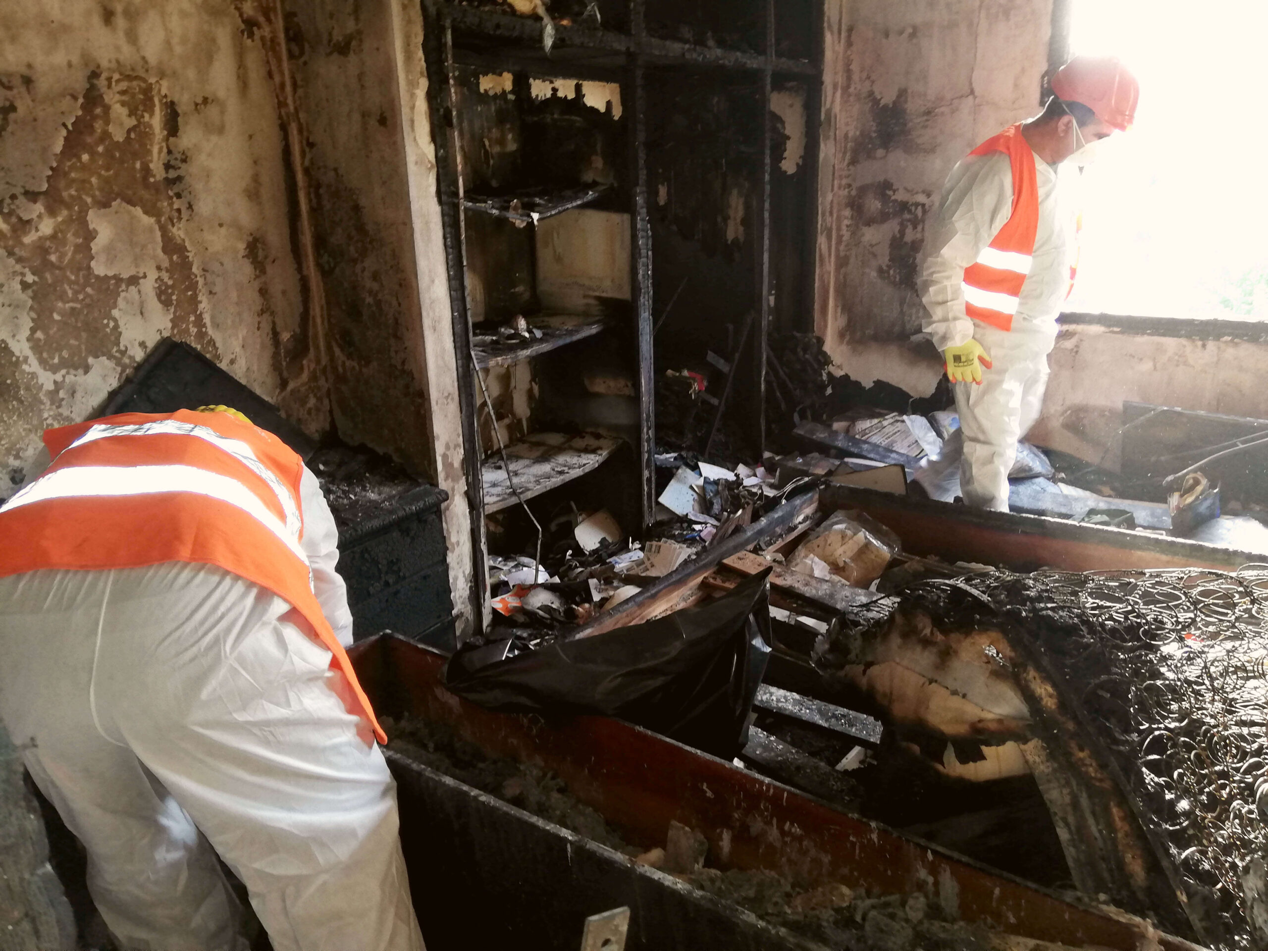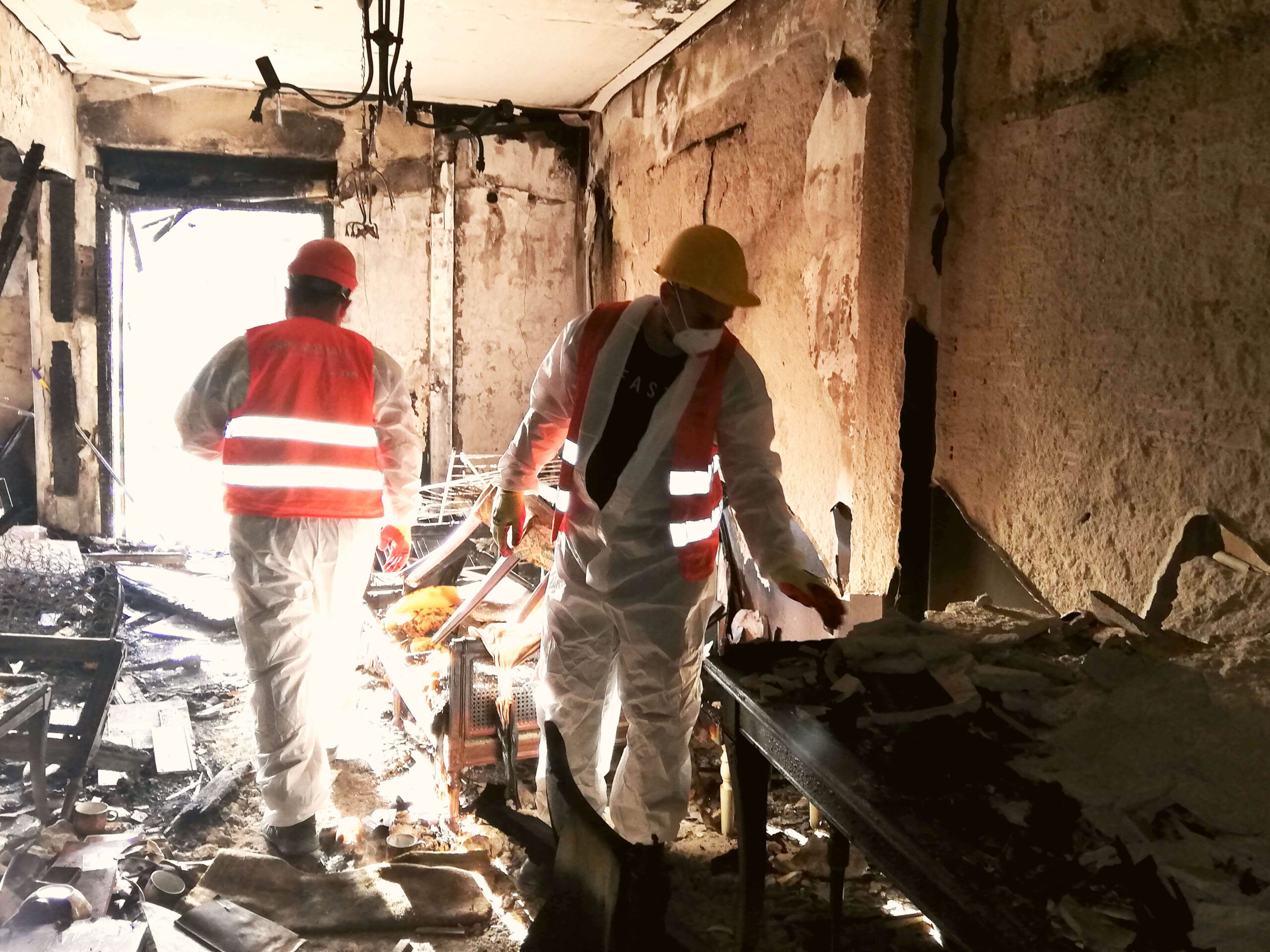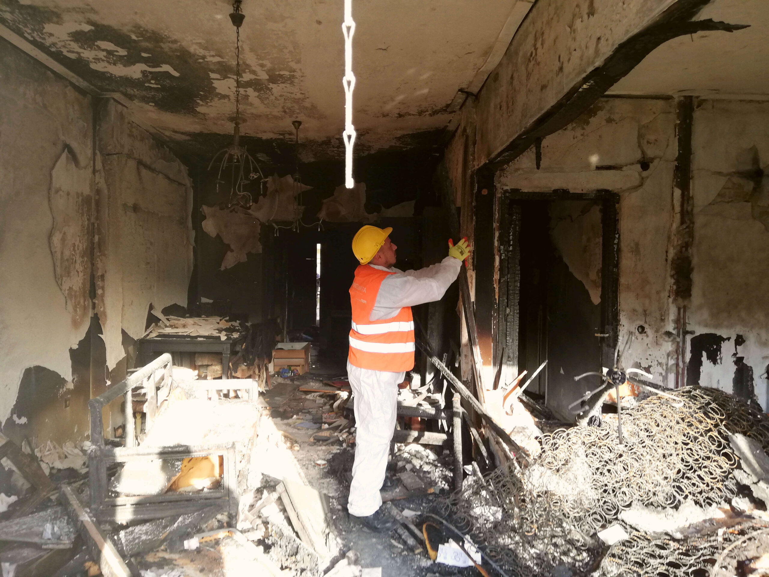 Σε κεντρικό δρόμο της Θεσσαλονίκης, σε ένα διαμέρισμα καμμένο από πυρκαγιά, φοράμε ειδικές στολές και είμαστε πλήρως εξοπλισμένοι για να αναλάβουμε τις απαραίτητες εργασίες αποξήλωσης.