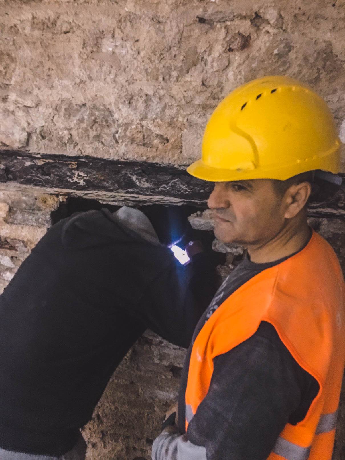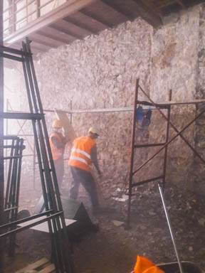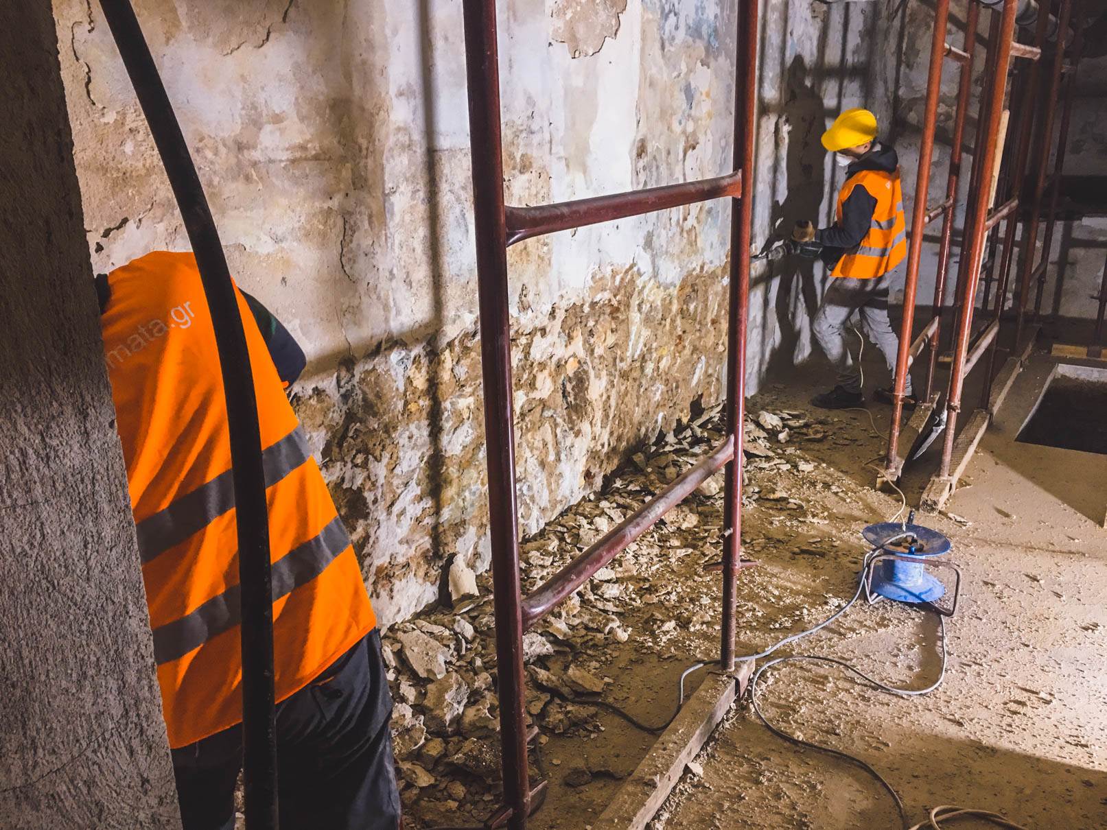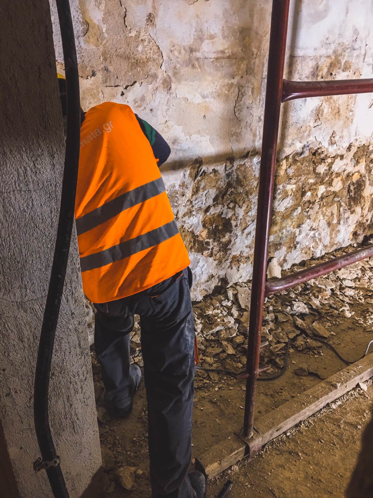 - Καθαίρεση και απόρριψη μπάζων των επιχρισμάτων τοίχων εσωτερικα του κτιριου και εξωτερικα μονο στον ‘ακαλυπτο’ του κτιριου στον τοίχο που παραμένει, και απορριψη προιοντων καθαιρεσης. Προσοχή τα επιχρίσματα θα αφαιρεθούν με προσοχή έως τoυ ύψους που θα υποδειχθεί από τους επιβλέποντες και αφού ληφθούν τα κατάλληλα μέτρα προστασίας του υφιστάμενου ζωγραφικού και γύψινου διακόσμου.