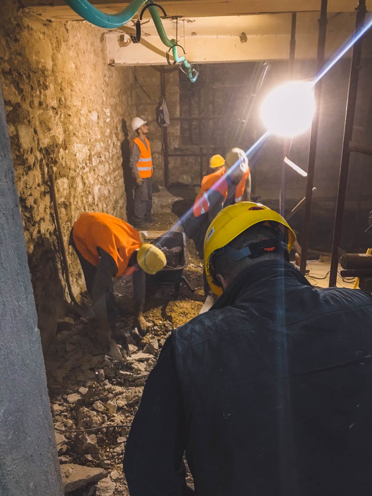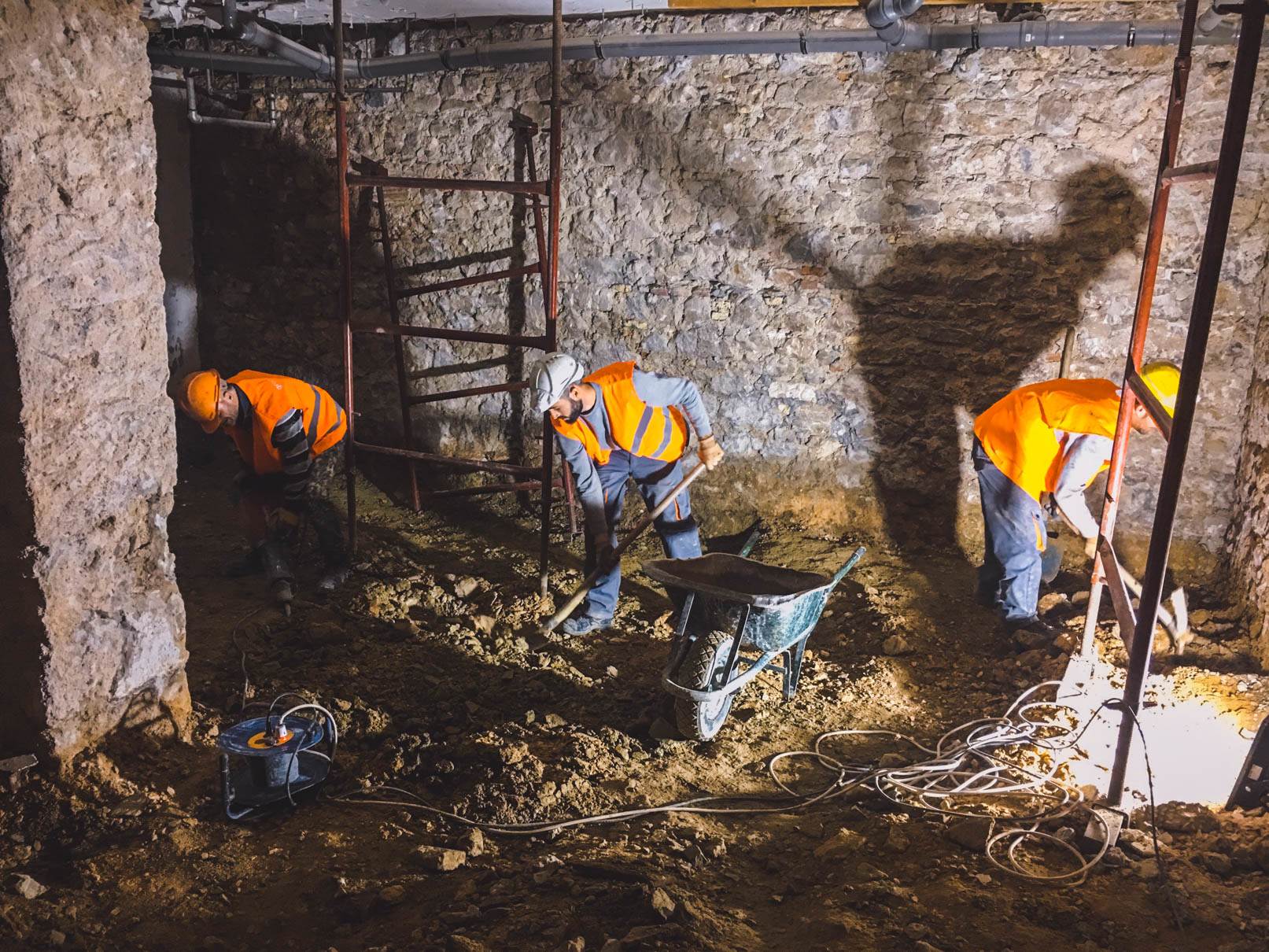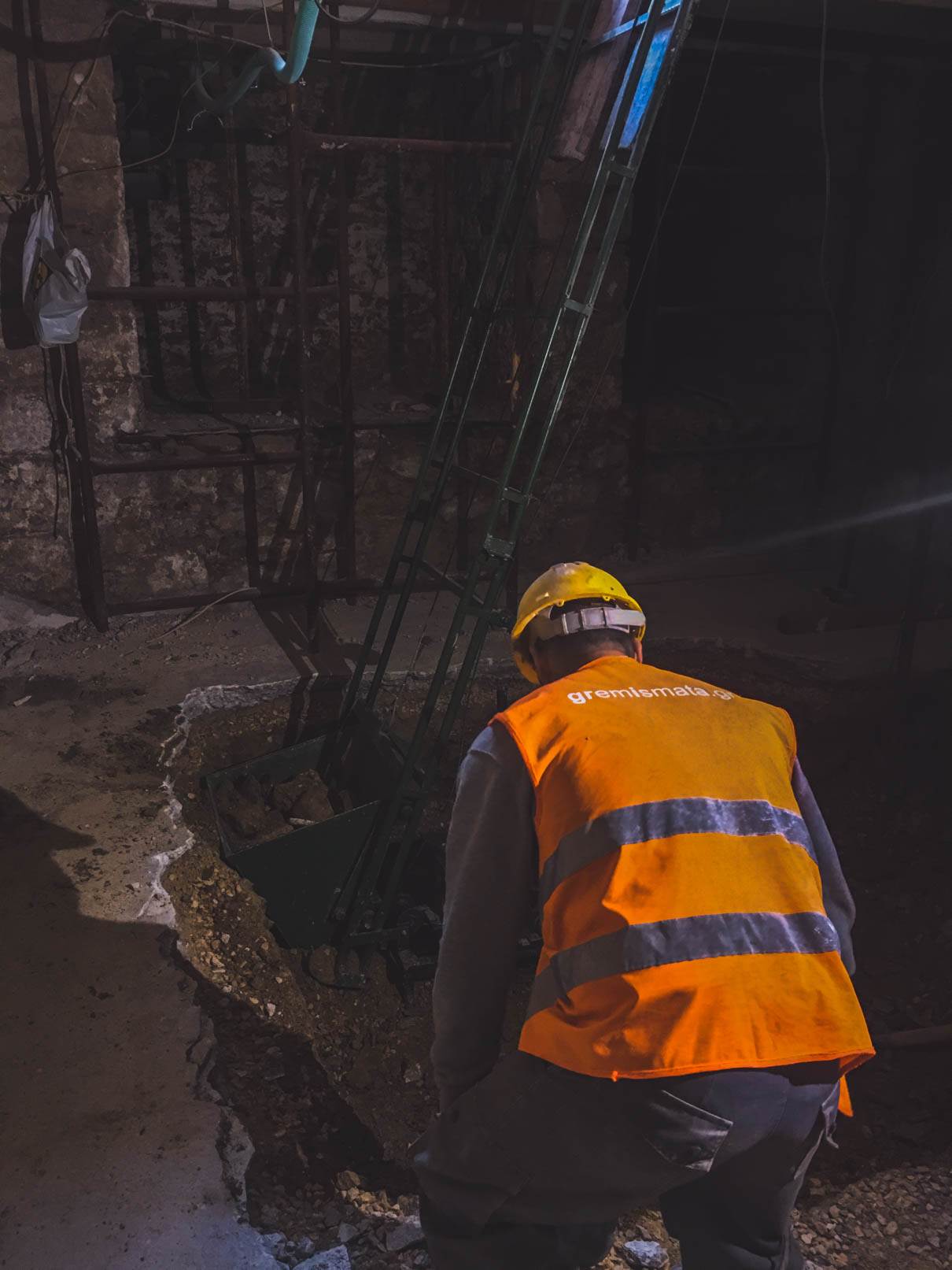 - Αποξήλωση της πλάκας δαπέδου του υπογείου με την επικάλυψη μωσαϊκου και απόρριψη προϊόντων καθαίρεσης. Εκσκαφή και απόρριψη προϊόντων εκσκαφής στην στάθμη του υπογείου μετά την αφαίρεση της πλάκας δαπέδου του υπογείου. Εκσκαφη 0.60m σε ολο το υπογειο και σε τμημα 4.00 Χ 4.00 m εκσκαφη 2.00 m