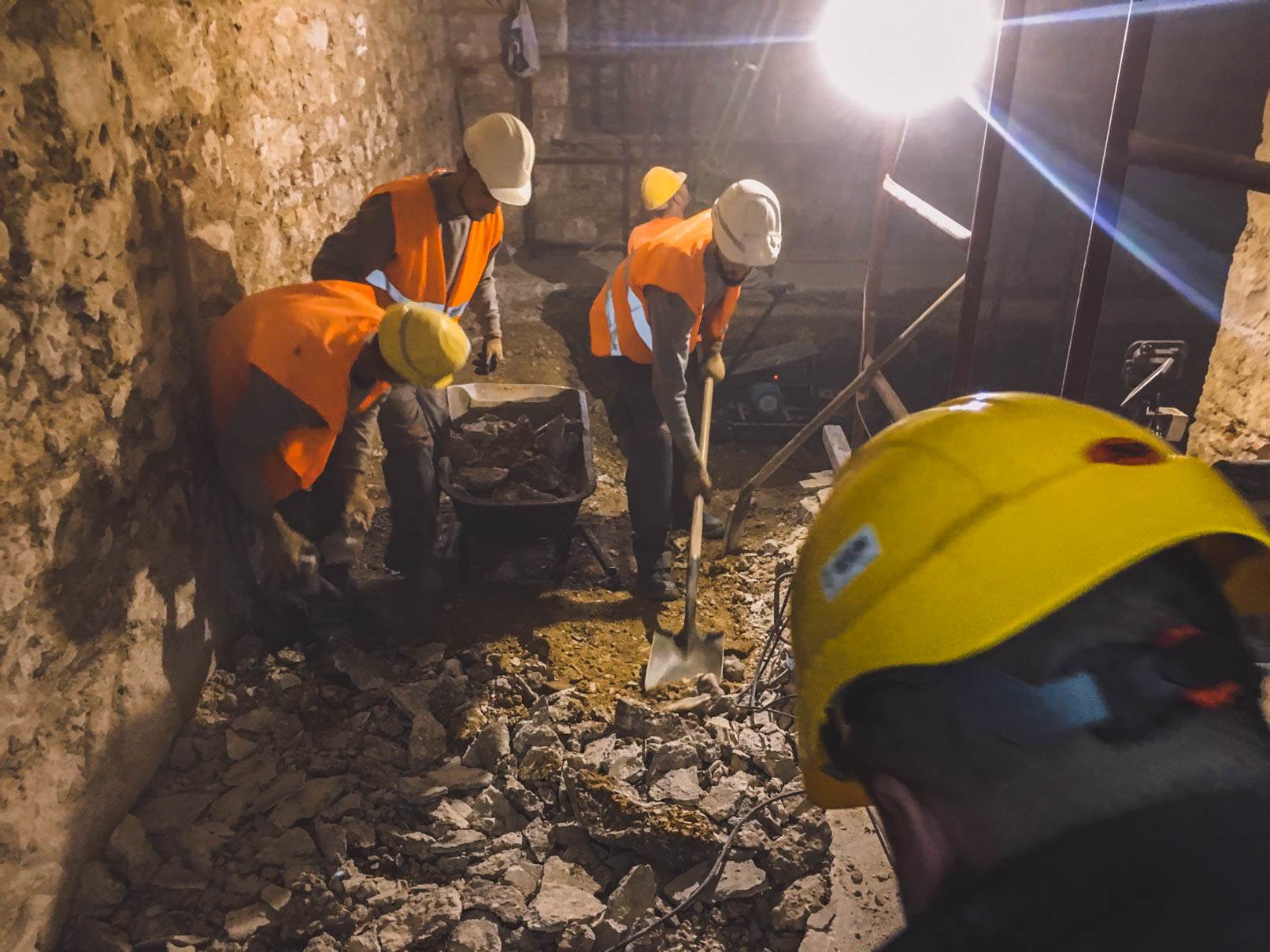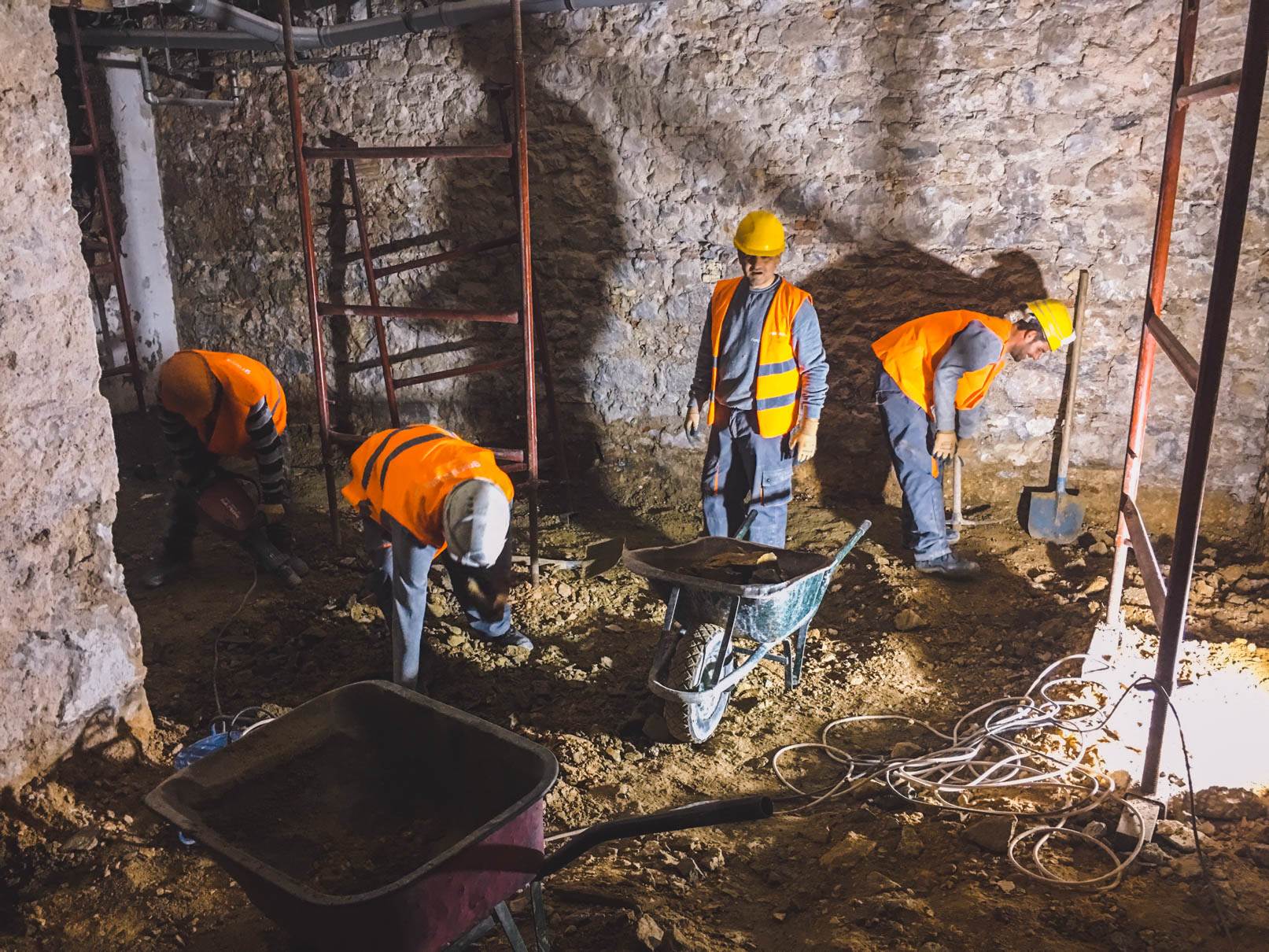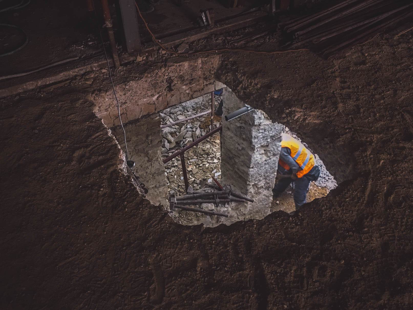 - Αποξήλωση της πλάκας δαπέδου του υπογείου με την επικάλυψη μωσαϊκου και απόρριψη προϊόντων καθαίρεσης. Εκσκαφή και απόρριψη προϊόντων εκσκαφής στην στάθμη του υπογείου μετά την αφαίρεση της πλάκας δαπέδου του υπογείου. Εκσκαφη 0.60m σε ολο το υπογειο και σε τμημα 4.00 Χ 4.00 m εκσκαφη 2.00 m